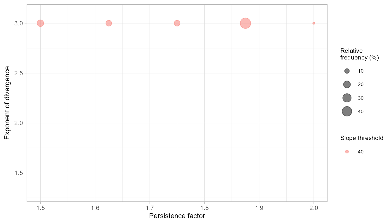 rwexp: divergence exponent (controls spread)rwper: persistence factor (controls directionality)rwslp: slope threshold (affects frictional resistance)